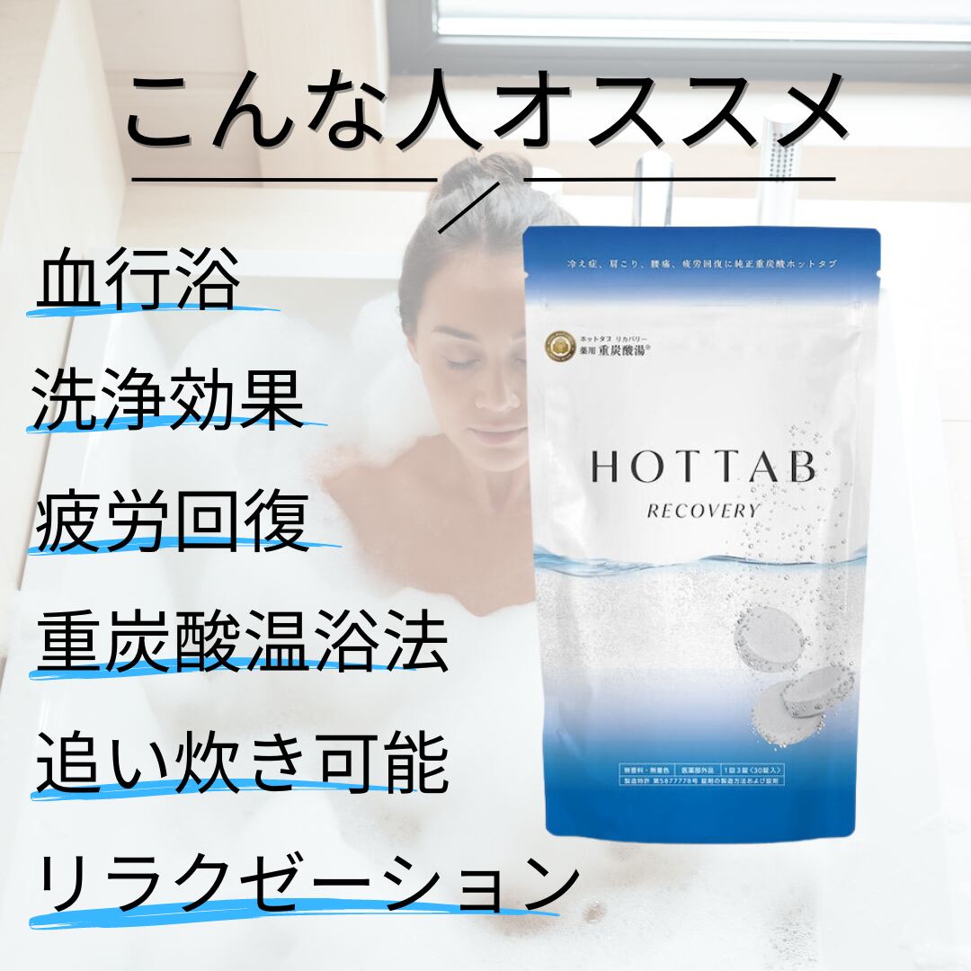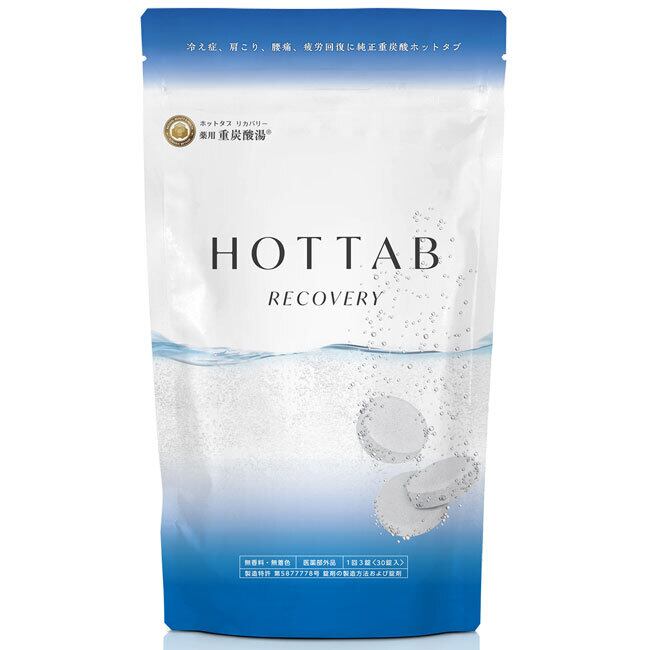 ホットタブは「重炭酸温浴法」に欠かせない重炭酸イオンを効率的に生み出す、重曹とクエン酸を錠剤化した独自製法の入浴剤です。微細な炭酸ガスの泡が継続的に吹き出し、お湯の中で重炭酸イオンと水素イオンに乖離。